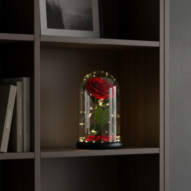 ガラスドームの中に咲く、一輪の鮮やかな赤いバラ。