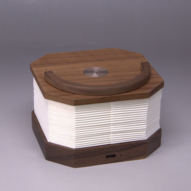 木の質感と、和紙を通した柔らかな光のコントラストが美しく、まるで小さなオブジェのようです。充電式でコードレスなので、ベッドサイドやリビングはもちろん、玄関や廊下など、好きな場所に自由に持ち運んで使えます。