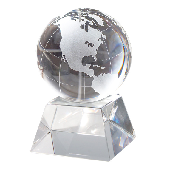 ブルークリスタルの球体にシルバー色のアクセントを施した、高級感あふれる台座付き地球儀です。透明感のある青色と上品なシルバーが調和し、オフィスデスクや受付、応接室などの空間を格調高く彩ります。贈答品や記念品に最適で、品質とデザインを兼ね備えた逸品です。