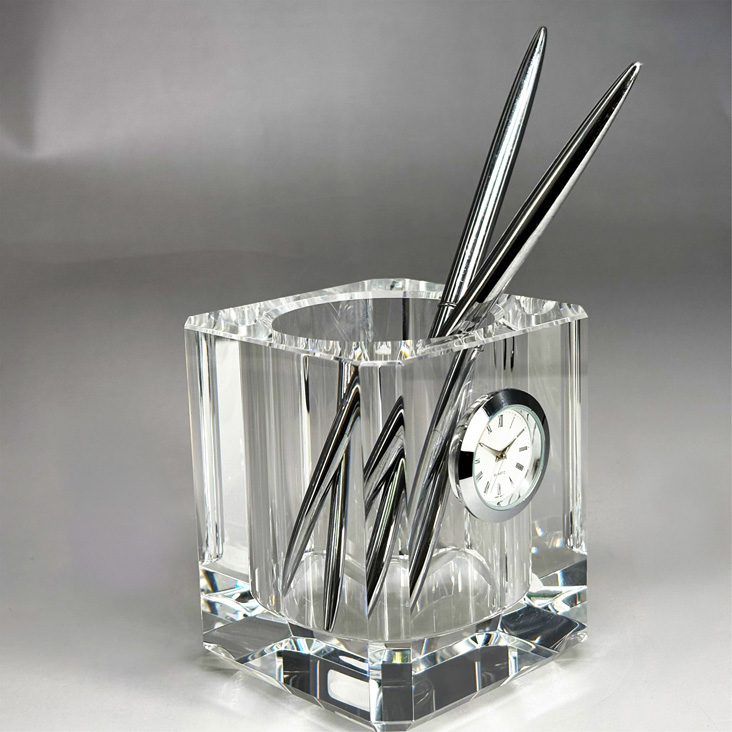 透明感あふれるクリアクリスタルに気品漂うクロックを組み合わせた、重厚感のあるラグジュアリーなペンホルダーです。ずっしりとした重みが存在感を放ち、ペーパーウェイトとしても優雅にデスクを彩ります。