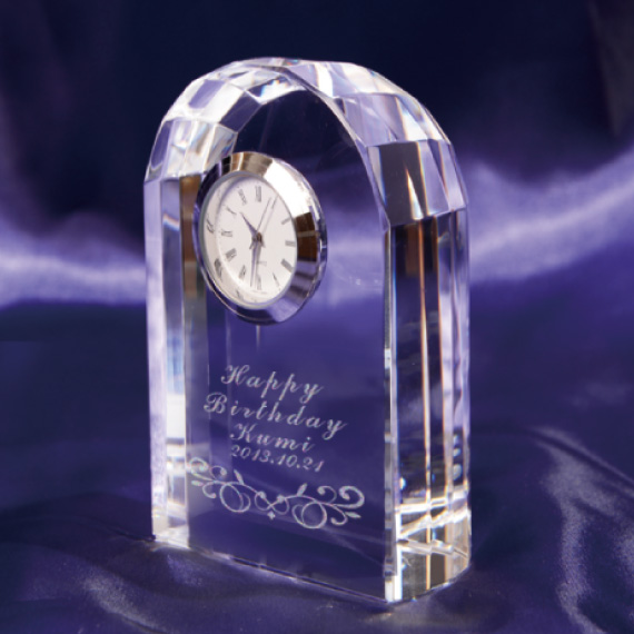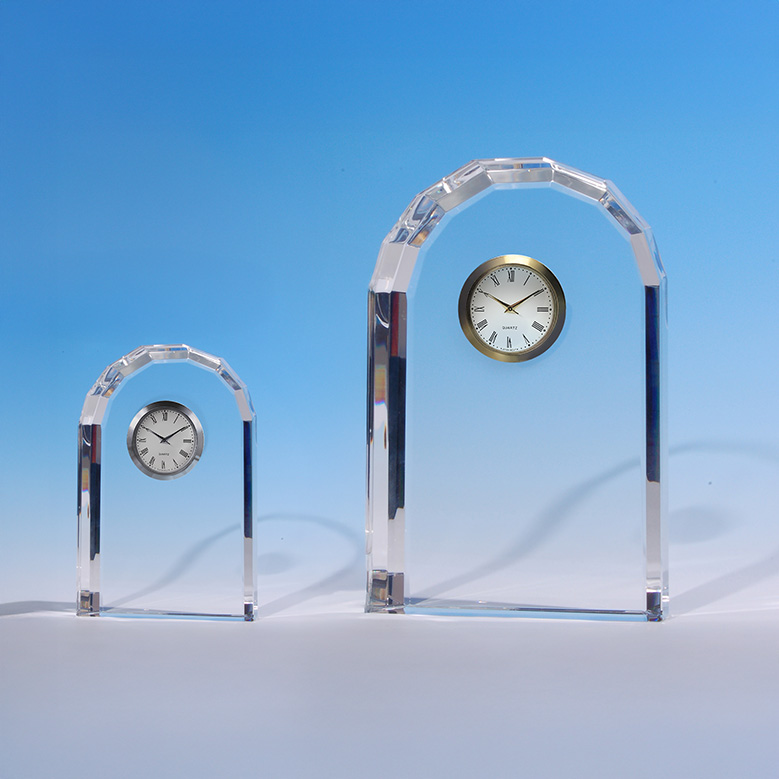 手頃な大きさながら存在感のある手頃なサイズ感ながら、厚みと透明感のあるクリスタルがしっかりとした存在感を放つアーチ型の置き時計です。シンプルながらも洗練されたフォルムは、オフィスや書斎、受付などさまざまな空間に自然に馴染みます。記念品や贈答品としても扱いやすく、名入れやロゴ入れによるカスタマイズにも適しています。