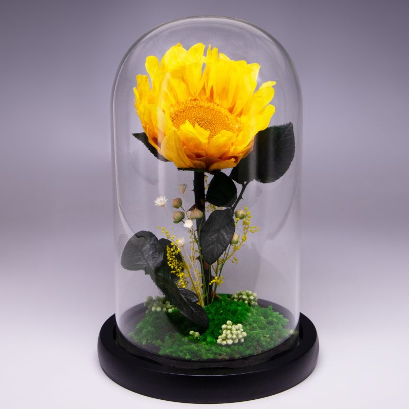 透明なアクリルドームの中に、明るい黄色の向日葵を丁寧にあしらった「向日葵ドーム」。