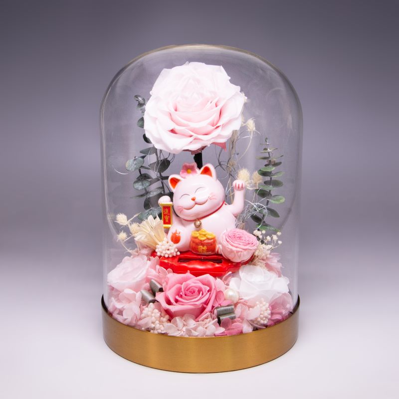 白とピンクを基調にした柔らかな色合いのアレンジメントを、透明アクリルドームに収めた上品なギフトアイテムです。