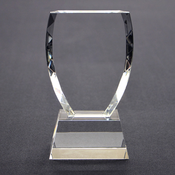 杯(カップ)を象ったシルエットに、ダイヤカットが贅沢に施されたガラス製のシールドです。カット面が大きく、光を受けるたびに繊細な反射を生み出し、正面から見ても側面から見ても視線を引く印象的なデザインに仕上がっています。盾としては珍しいフォルムが目を惹き、記念品として特別感を演出します。